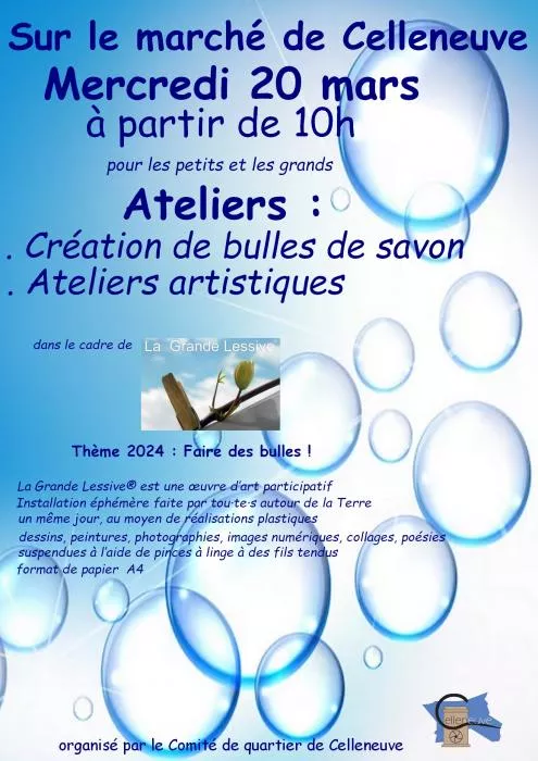 Mercredi 20 mars, dans le cadre de La Grande Lessive, nous proposons aux petits et aux grands une animation sur le thème : faire des bulles !