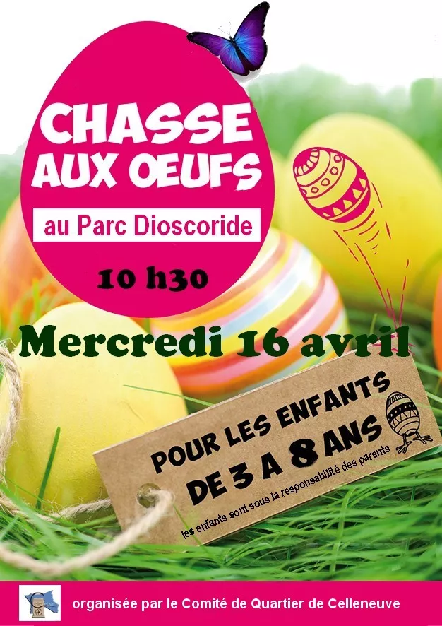 Rendez-vous à 10h30 à l'entrée du Parc Dioscoride, pour le top départ d'une chasse aux oeufs ! A l'issu de votre récolte vous pourrez rejoindre le stand du Comité de Quartier sur le marché de l'esplanade pour retirer votre récompense, boire un verre de sirop et déguster quelques gourmandises....