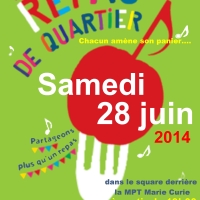 Samedi 28 juin 2014 : Comme chaque année, nous vous attendons dans le petit jardin derrière la MPT Marie Curie pour le repas de quartier. Le principe est simple: vous amenez boisson, nourriture et bonne humeur... Nous partageons le tout autour de grandes tables ! ... Le Comité vous offre l'apéritif.