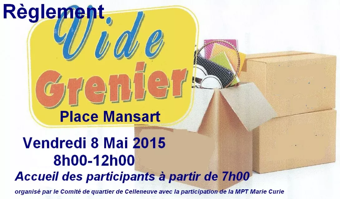 5. NE RIEN LAISSER à la fin du vide grenier : ni invendus, ni déchets, ni sacs, ni cartons… La mairie ne fournit pas de container et n’assure pas de nettoyage pour cette manifestation.