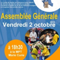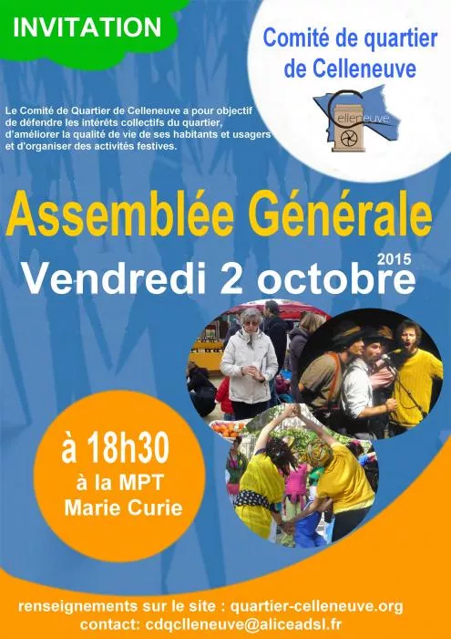 le Vendredi 2 octobre, Assemblée Générale du Comité de quartier, à 18h30 à la MPT Marie Curie: Les habitants du quartier de Celleneuve sont invités à participer à l'Assemblée Générale du Comité de quartier de Celleneuve.