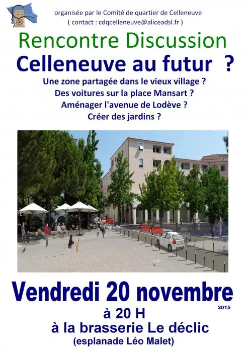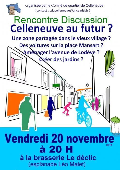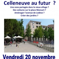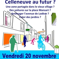 Nous invitons tous les habitants de Celleneuve à participer à la réunion du 20 novembre (20h00 à la Brasserie Le déclic, sur l'esplanade Léo Malet ). Venez partagez vos idées, vos envies , vos réactions pour Celleneuve au futur.