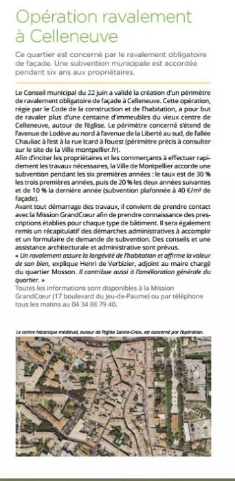 Le Conseil municipal du 22 juin a validé la création d’un périmètre de ravalement obligatoire de façade à Celleneuve. Cette opération, régie par le Code de la construction et de l’habitation, a pour but de ravaler plus d’une centaine d’immeubles du vieux centre de Celleneuve, autour de l’église. Le périmètre concerné s’étend de l’avenue de Lodève au nord à l’avenue de la Liberté au sud, de l’allée Chauliac à l’est à la rue Icard à l’ouest (périmètre précis à consulter sur le site de la Ville montpellier.fr).