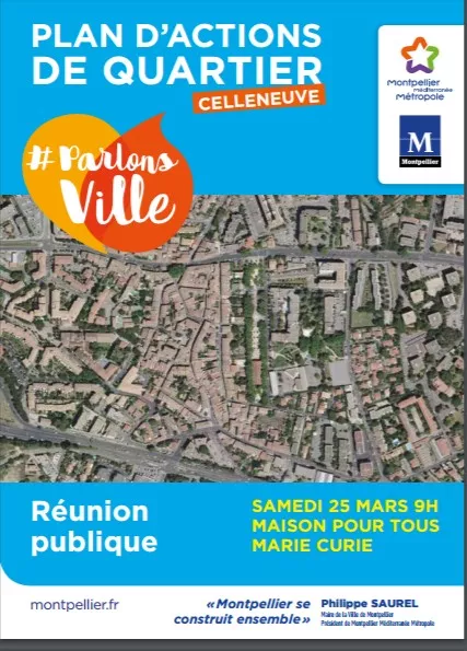 Philippe SAUREL Maire de la Ville de Montpellier Président de Montpellier Méditerranée Métropole vous convie, le samedi 25 mars 2017, à une première réunion publique de concertation sur le projet de réaménagement des espaces publics (avenue de Lodève, rue Marcellin Albert, rue des Écoles, rue de l’Église, rue Jules Guesde...) à coordonner dans le cadre d’un plan d’actions à l’échelle du quartier Celleneuve.