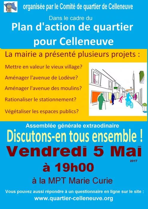Afin de faire remonter des contributions collectives sur le plan d'action quartier Celleneuve, discutons ensemble des propositions de la Mairie présentées lors de la réunion du 25 mars dernier.