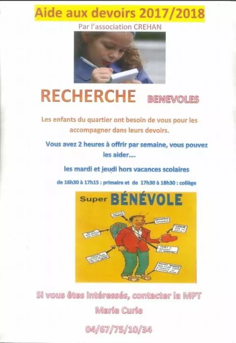 Recherche bénévoles pour aide aux devoirs, année 2017/2018.  heures par semaine.