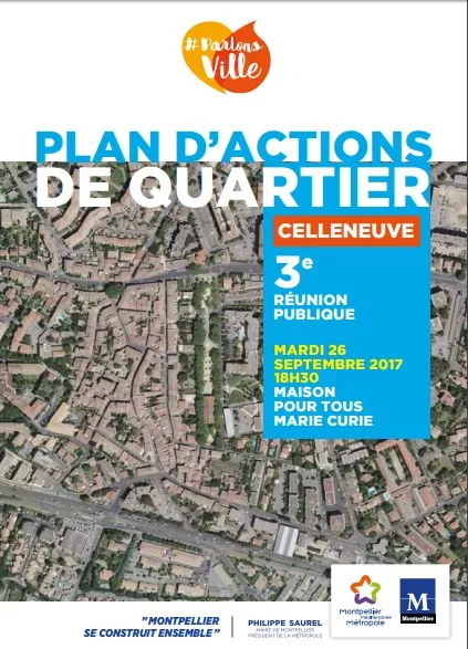 Philippe SAUREL, Maire de la Ville de Montpellier, Président de Montpellier Méditerranée Métropole, vous convie, le mardi 26 septembre 2017, à une troisième réunion publique de concertation sur le projet de réaménagement des espaces publics (avenue de Lodève, rue Marcelin Albert, rue des Écoles, rue de l’Église, rue Jules Guesde...) à coordonner dans le cadre d’un plan d’actions à l’échelle du quartier Celleneuve.