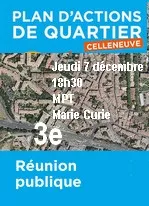 Jeudi 7 décembre 2017 à 18h30 aura lieu à la maison pour tous Marie Curie, la troisième réunion publique du Plan dActions de quartier Celleneuve.