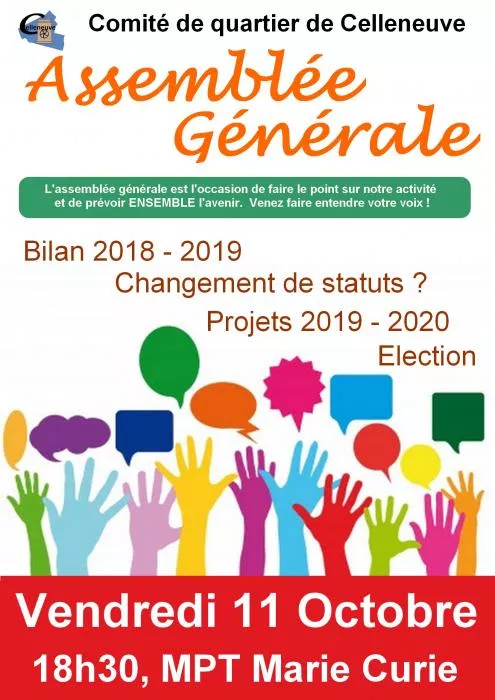 Nous avons l’honneur de vous inviter à participer à l’assemblée générale ordinaire de l’association Comité de quartier de Celleneuve. Celle-ci aura lieu le Vendredi 11 octobre 2019 à 18h30 à la MPT Marie Curie