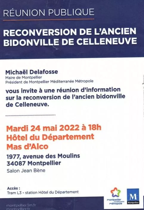 Michaël Delafosse, maire de Montpellier, président de Montpellier Méditerranée Métropole, vous invite à une réunoin d'information sur la reconversion de l'ancien bidonville de Celleneuve.