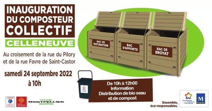 Inauguration d' un composteur collectif dédié au quartier de Celleneuve, samedi 24 septembre à 10h00, au croisement de la rue du pilory et de la rue Favre de St Castor (sur le côté du cimetière).