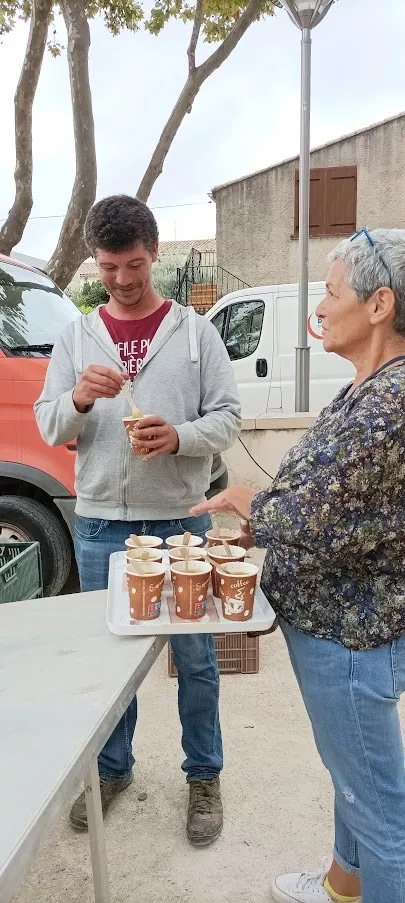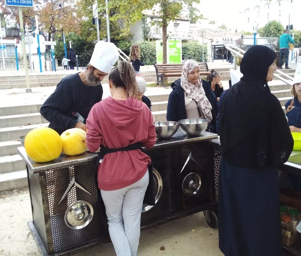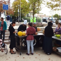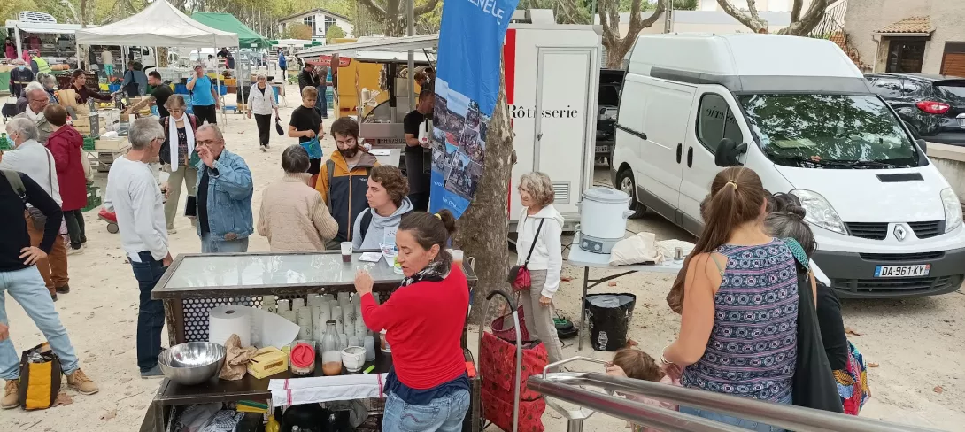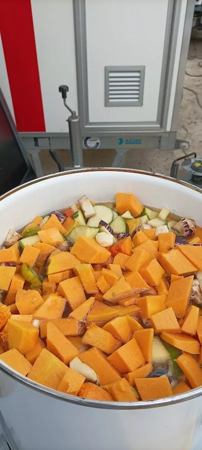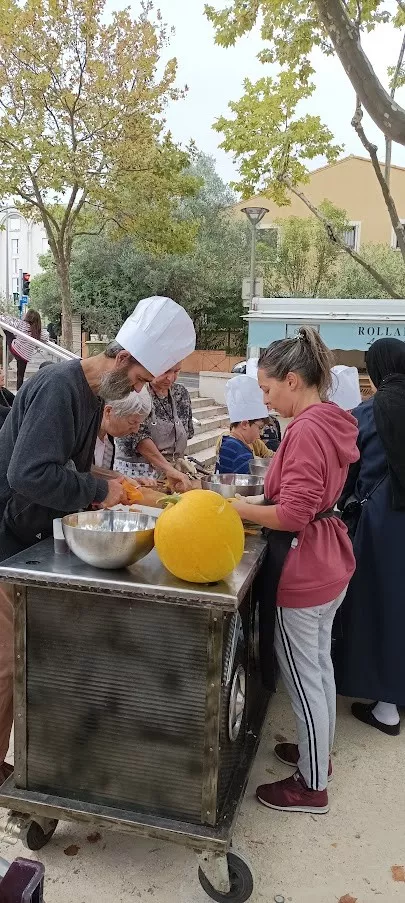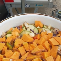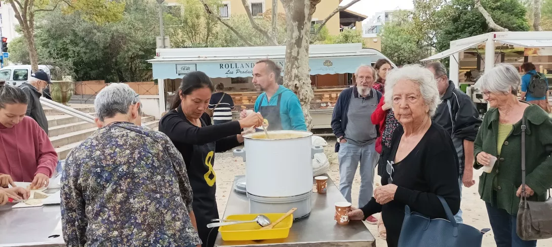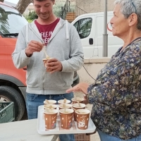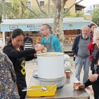L'automne était bien là, avec son ciel gris, mais il nous a épargné la pluie ! Vous avez répondu présent, pour préparer une grosse soupe à partir des légumes du jardin . Merci à vous tous et à l'Esperluette. 10l de soupe c'est long à cuire... mais nous avons pu la déguster avec tous les clients du marché et les commerçants. Elle fut fort apprécié !