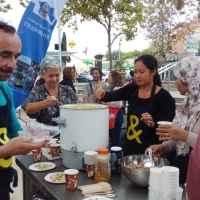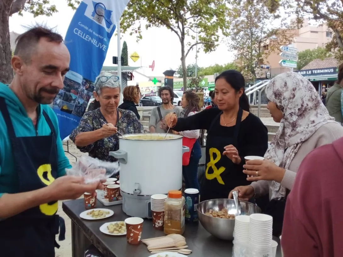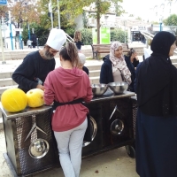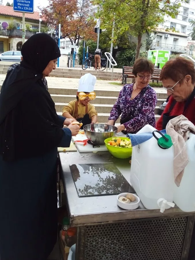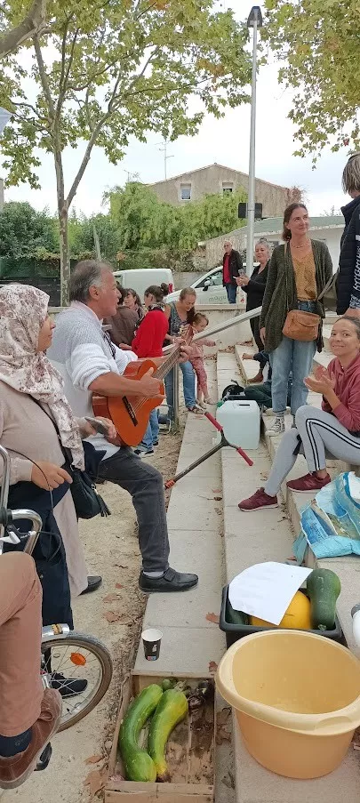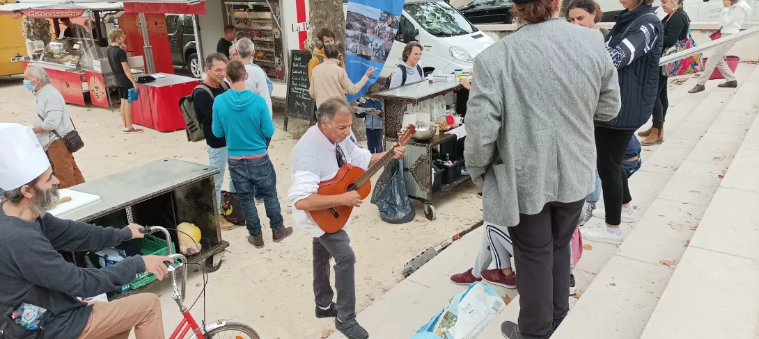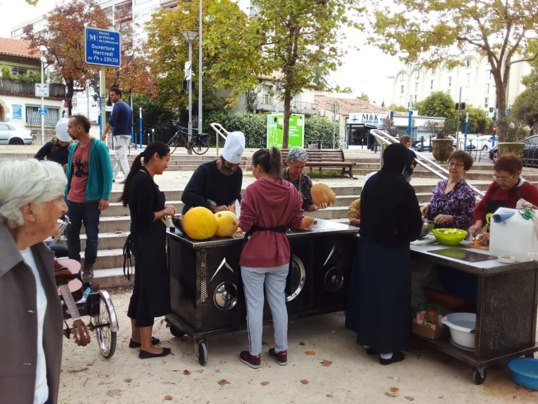 L'automne était bien là, avec son ciel gris, mais il nous a épargné la pluie ! Vous avez répondu présent, pour préparer une grosse soupe à partir des légumes du jardin . Merci à vous tous et à l'Esperluette. 10l de soupe c'est long à cuire... mais nous avons pu la déguster avec tous les clients du marché et les commerçants. Elle fut fort apprécié !